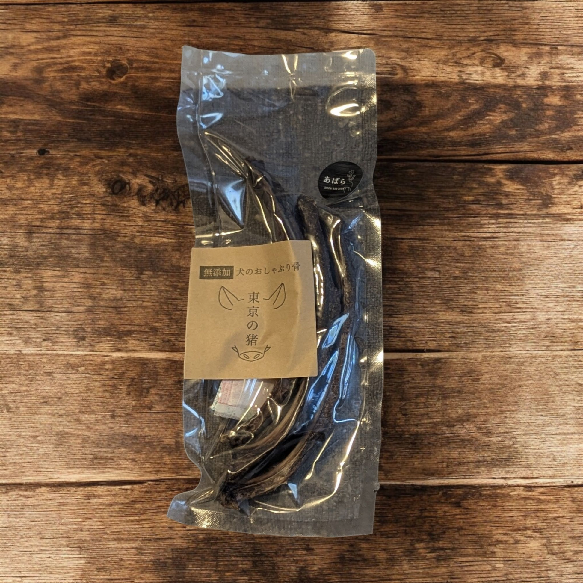 私たちの「猪の犬のおしゃぶり骨【あばら】」は、完全無添加。東京産のイノシシを使い、手作りでそのまま仕立てで作られた商品です。